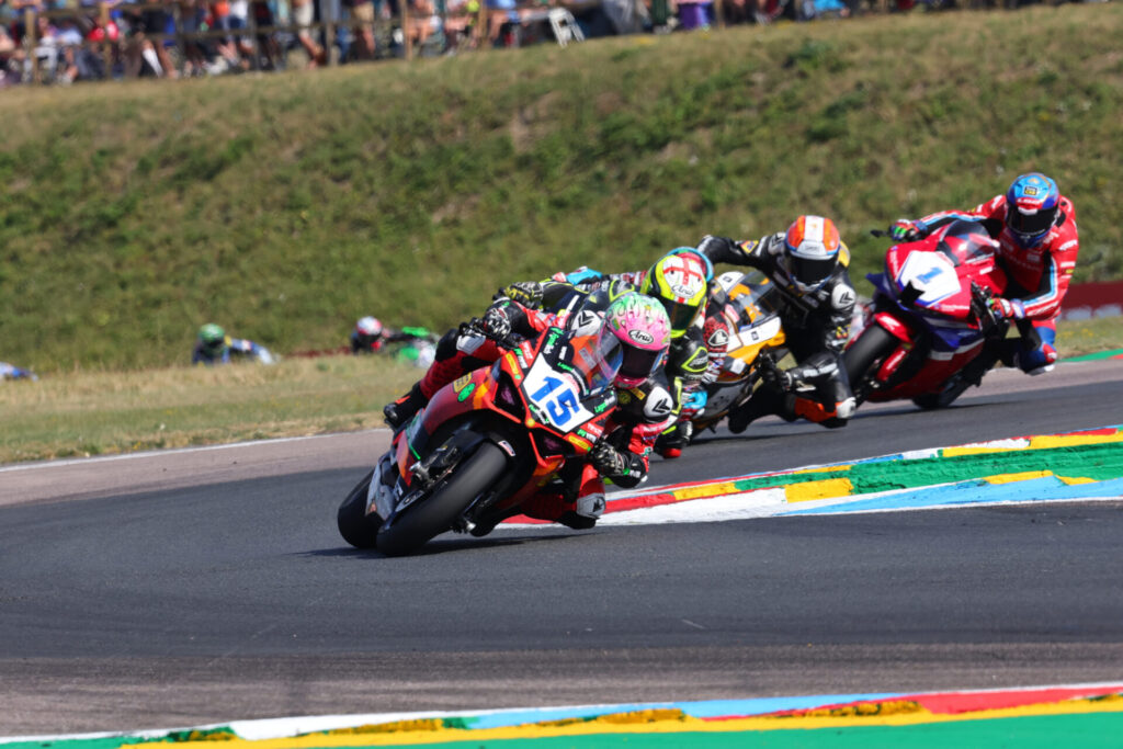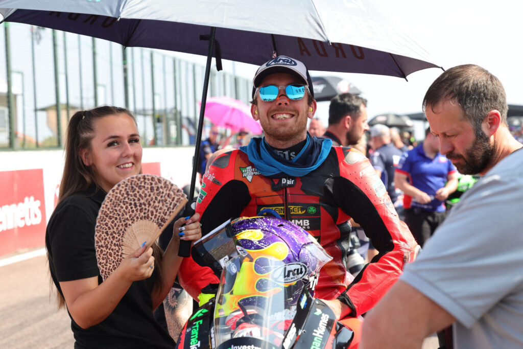 Both Eugene McManus and Harry Truelove had done more than enough in the two Friday Free Practice sessions to go straight into Q2 on Saturday morning at Thruxton. In the short 15-minute session, both MMB Racing riders entered the pits after just five minutes. McManus was 16th at the time and Truelove 19th. They both returned to the track a few minutes later after some adjustments, which worked. McManus put his Ducati Panigale on the front row in third position, and Truelove improved to start 12th on the grid.